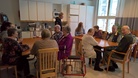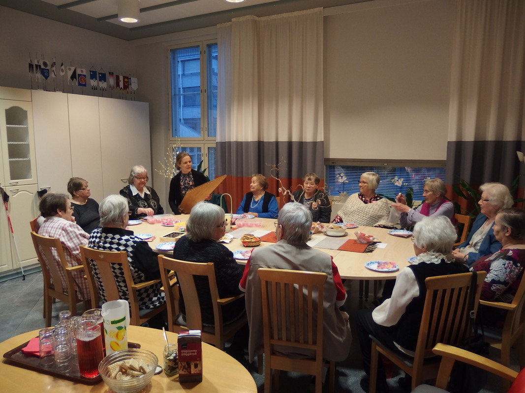 Kansalaisopiston Hyvän tuulen kerho pitää vuoden viimeistä tapaamistaan viereisessä huoneessa ja sieltä kuuluu niin laulua kun puhetta. Juhlivat samalla Suomi 100v päivää.
